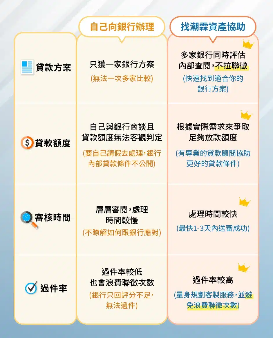 自己請假去銀行處理,該如何申辦、流程怎麼走,可能在不熟的情況下,相當浪費時間,如果透過潮霖資產幫你處理,他們處理時間較快,最快1~3天內送審成功,幫你節省很多時間,且在它們的協助下,若條件不足不會貿然申請,可以減少自己隨意送件導致聯徵紀錄次數增加。
