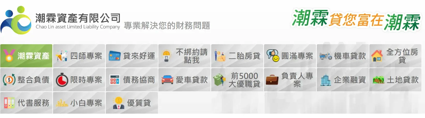 潮霖資產是一家貸款顧問公司,提供各種類型的貸款方案,例如多種的小額貸款、車貸、房貸、機車貸等等。此外,潮霖資產的品牌特色標榜: