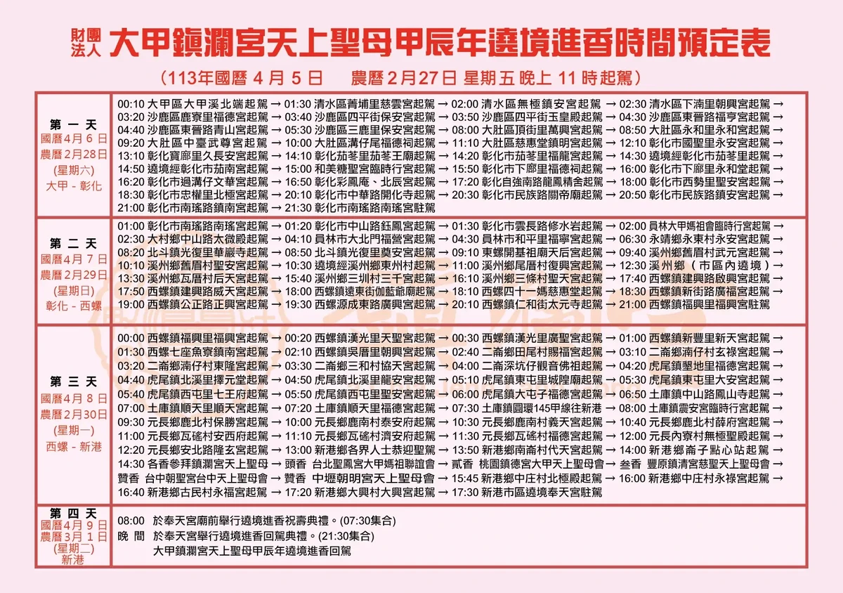 - 第九天|4月13日(星期日,農曆三月十六): 回鑾大甲鎮瀾宮。